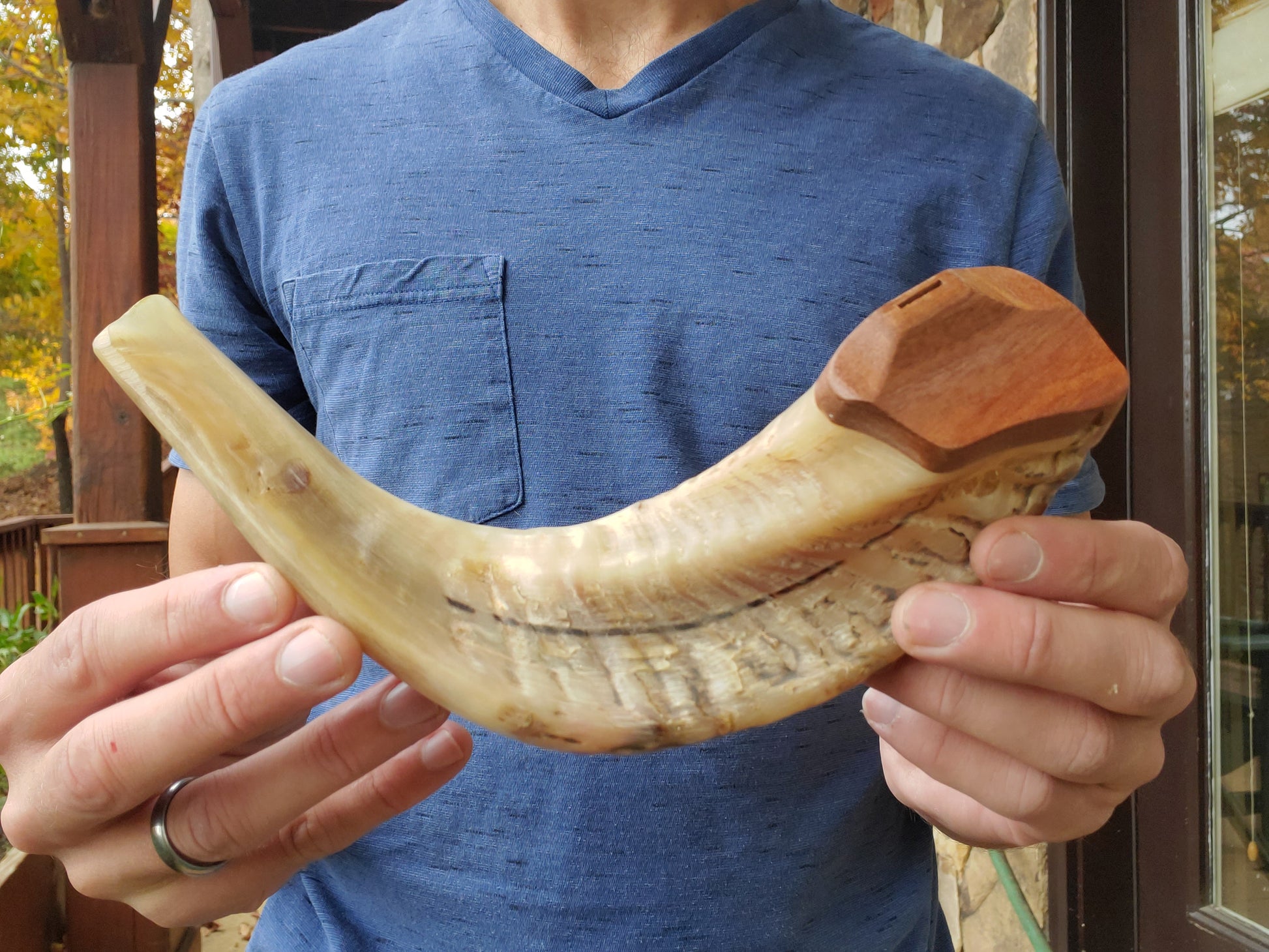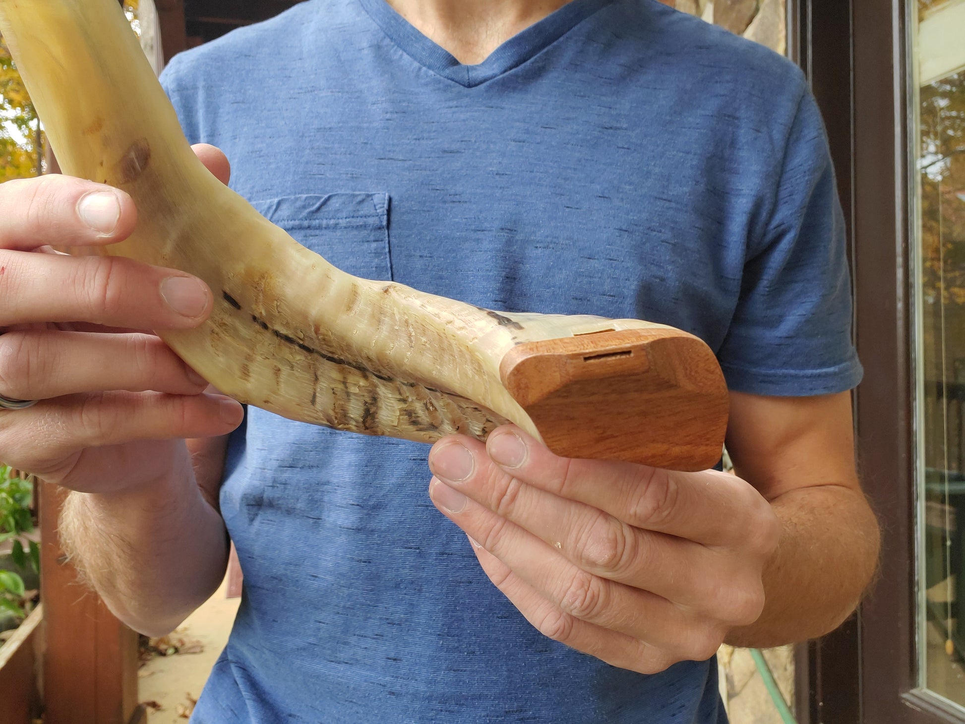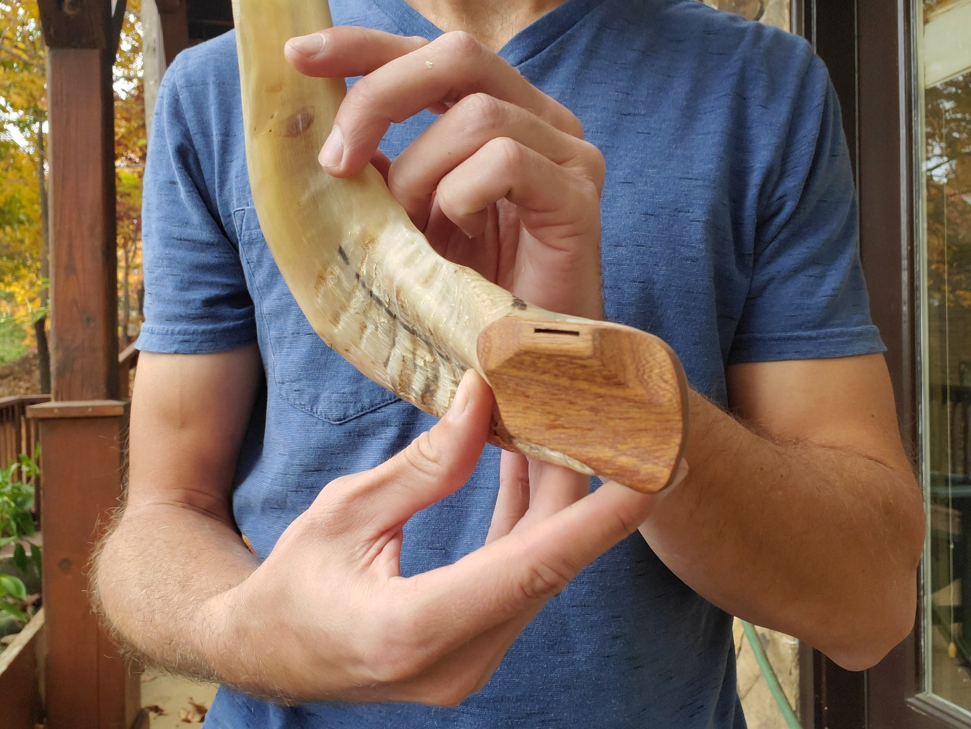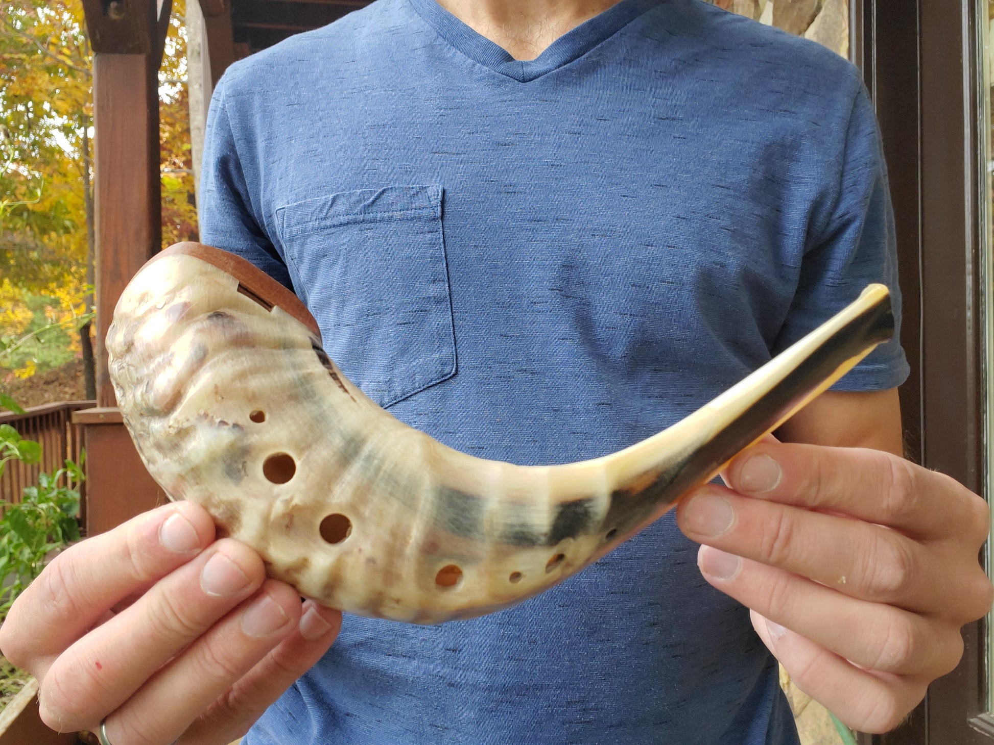 The Shoflute is a wonderful collision of the ancient the Shofar (Hebrew Instrument), and the Native American style flute (First Nation's instrument). It's made of a ram's horn and it has a wooden mouthpiece. The mouthpiece is fixed to the horn and allows you to blow to play the sound, very similar to an ocarina style instrument. Holes in the horn create different pitches and make up a scale. We have the Pentatonic scale and Major scale to choose from. The sound of the ram's horn flute is clear, melodic and aquatic.
